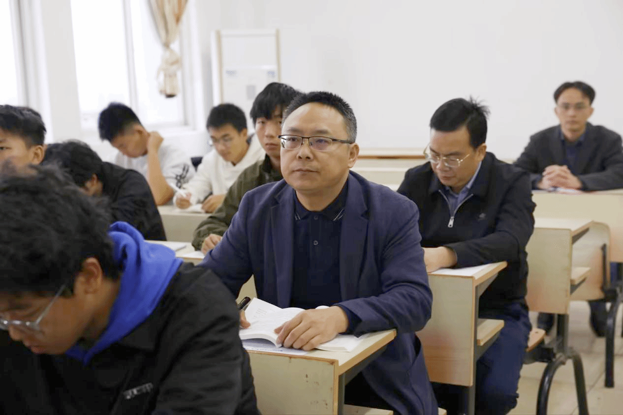 听课过程中,邱建丁专注聆听,认真观察课堂互动与教学组织,细致记录教学设计与实施情况。肖蓉老师授课逻辑清晰、重点突出,注重理论联系实际,及时将党的二十届四中全会精神有机融入课程内容。课堂上,学生精神饱满,积极思考互动,展现出良好的学习状态。