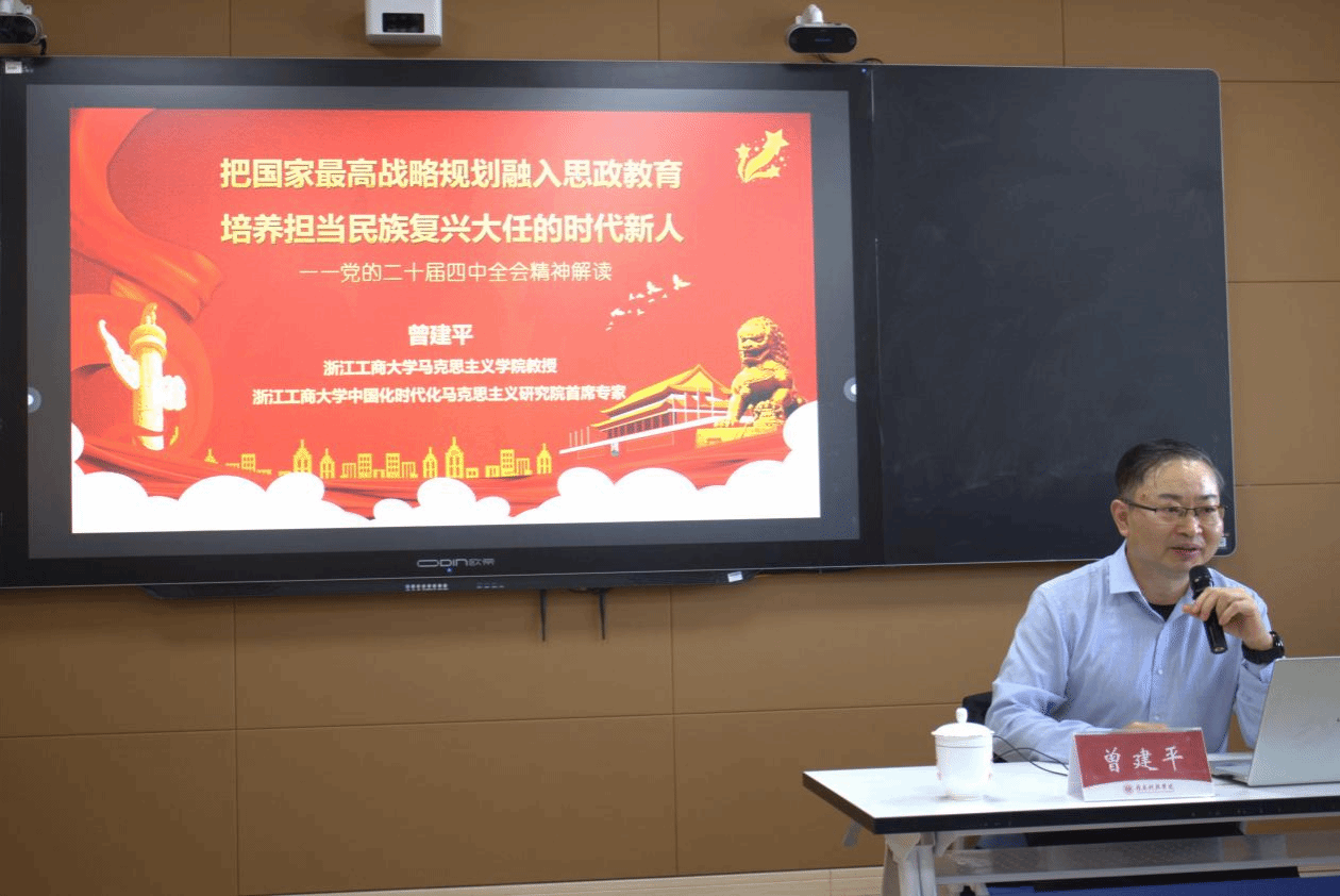 11月25日下午,崇善楼628智慧教室内思维激荡,气氛热烈,一场以“把国家最高战略规划融入思政教育 培养担当民族复兴大任的时代新人——党的二十届四中全会精神解读”为主题的高质量讲座在此隆重举行。马克思主义学院特邀浙江工商大学马克思主义学院二级教授曾建平担任主讲,我校党委委员、宣传部部长邓亦林,马克思主义学院班子成员和全体教师,赣州市大中小学思政教育一体化建设第一联盟体的部分领导与教师代表齐聚一堂,共赴这场启迪智慧的思想盛会。
